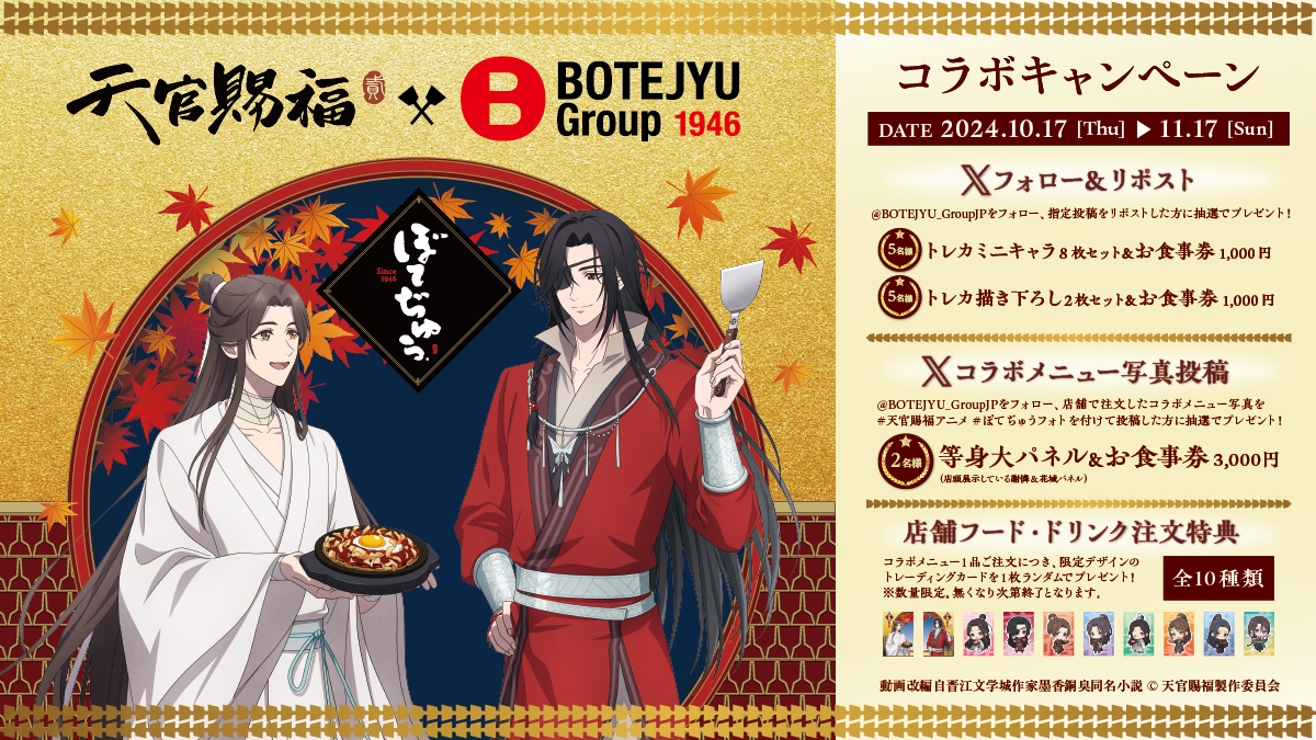 「BOTEJYU Group」2024年10月17日(木)~2024年11月17日(日)期間で、アニメ『天官賜福 貮』とのコラボレーション公開記念タイアップキャンペーンを実施いたしました。