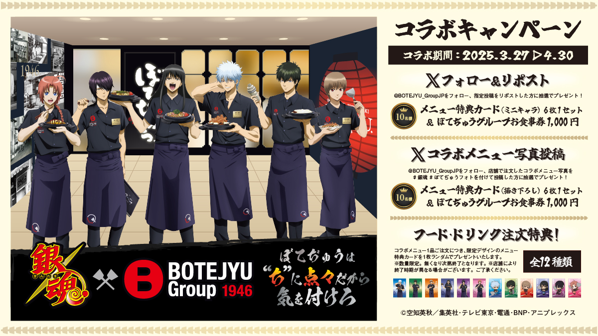 「BOTEJYU Group」2025年3月27日(木)~2025年4月30日(水)期間で、TVアニメ『銀魂』とのコラボレーション公開記念タイアップキャンペーンを実施いたしました。